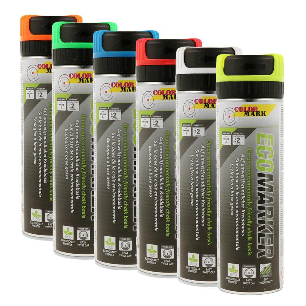 Het voordeel van Colormark Ecomarker krijtspray is dat het na een tijdje vanzelf verdwijnt door regen. U kunt kiezen uit verschillende kleuren, zoals wit, groen, oranje en geel.